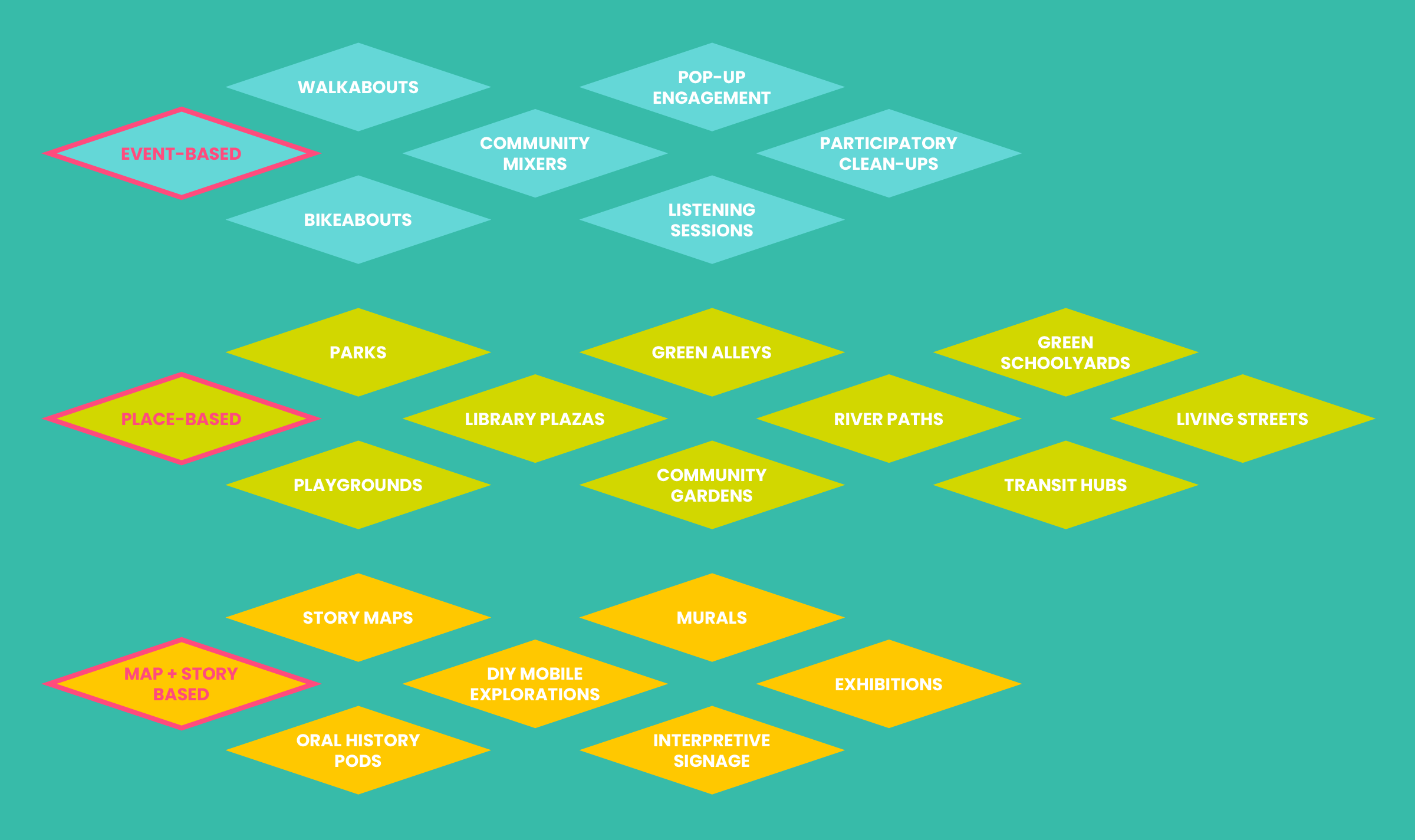Our 3 types of neighborhood networks comprise an ecosystem of “resilient community hubs” as multi-purpose places of gathering, sites for human connection as we adapt to pandemics, and shelter during extreme climate events. They are also places of celebration. We envision centering these neighborhood networks at and around schools, libraries, housing, and transportation corridors, ensuring equitable access to all.